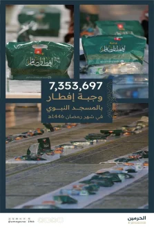 قدمت الهيئة العامة للعناية بشؤون المسجد الحرام والمسجد النبوي 7.343.697 وجبة إفطار صائم في المسجد النبوي خلال شهر رمضان المبارك لهذا العام.