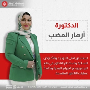 ومن جانبها أوضحت الدكتورة الاستشارية أزهار العضب على أنه تم مؤخراً التعاقد مع مستشفى البدور للجراحات التخصصية الواقع في الكرادة وسط العاصمة العراقية بغداد حيث سيكون التواجد في العاصمة بغداد يوم الاثنين من كل اسبوع من الساعة العاشرة صباحا الى الساعة الخامسة مساءًا.