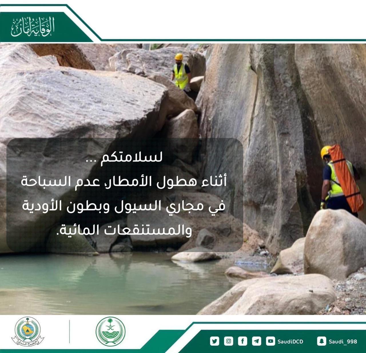 وحذرت من التنزه حول مجاري السيول أو المستنقعات المائية أو السباحة فيها كونها أماكن غير مناسبة لذلك وتشكل خطورة كبيرة، مع أهمية تفعيل دور الأسرة التوعوي في المحافظة على سلامة الأطفال وإبعادهم عن الأماكن الخطرة المحتملة، والالتزام بتعليمات الدفاع المدني المعلنة عبر وسائل الإعلام المختلفة ومواقع التواصل الاجتماعي حفاظًا على سلامتهم .