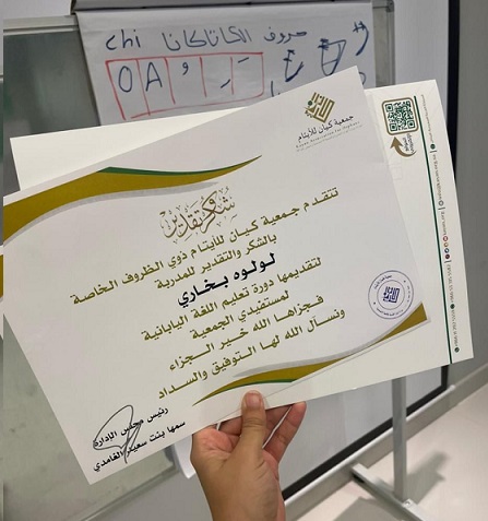 وقد شكرت جمعية كيان للأيتام المدربة الأستاذة لولوة بخاري على  تعاونها مع الجمعية ودعم أبنائها بتمكينهم من الأحرف اليابانية قراءة وكتابة ، وعدد من الكلمات وفتح باب لتوسيع مداركهم حول تعلم اللغات . وتم تقديم شهادة شكر وتقدير لها على جهودها المباركة .