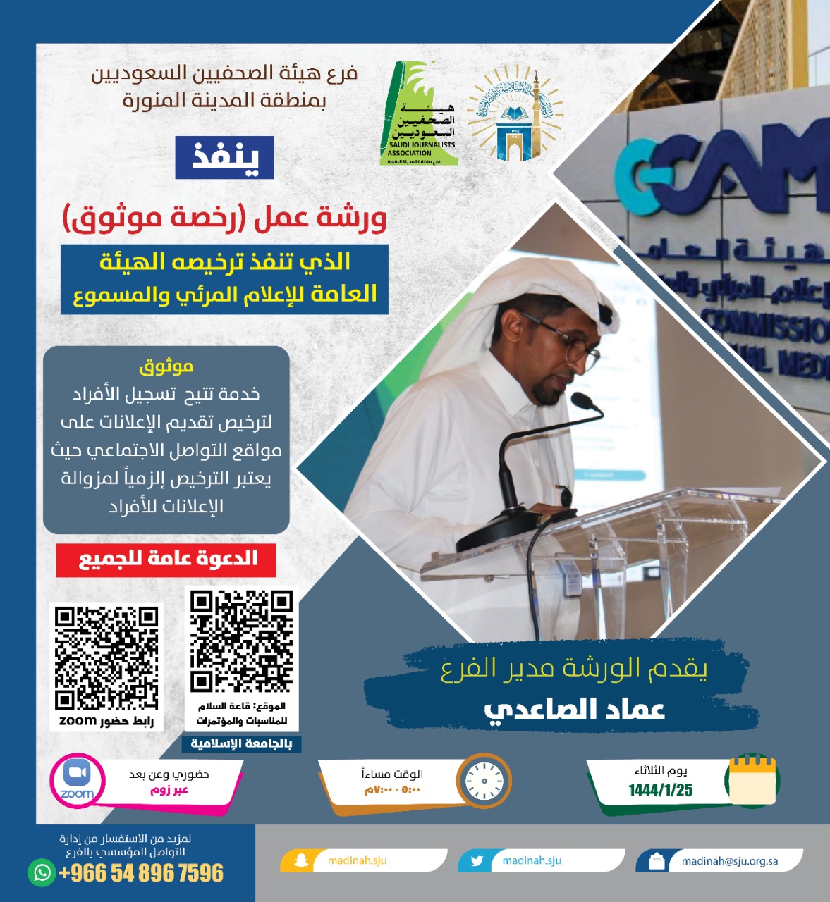 يعتزم فرع هيئة الصحفيين السعوديين بمنطقة المدينة المنورة إقامة ورشة عمل بعنوان (رخصة موثوق) الذي تمنح ترخيصه الهيئة العامة للإعلام المرئي والمسموع، حيث يقدمها مدير الفرع الأستاذ عماد بن منصور الصاعدي، وذلك يوم الثلاثاء الموافق 25 / 1 / 1444هـ بقاعة السلام بالجامعة الإسلامية حضورياً وسوف يتم بث الورشة عن بعُد عبر تطبيق الزووم من الخامسة إلى السابعة مساءً.
