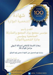 كرم د. تركي بن عبيد مؤسس مجتمع رواد المجتمع ومؤسس جائزة الشخصية المؤثرة نخبة من المسؤولين المعنيين وأصحاب السمو الأمراء وعدد من الإعلاميون والصحفيون والاكاديميين والمستشارين والمدربين والمتطوعين المهتمين بالمبادرات الاجتماعية والمنصات الرقمية والجمعيات الخيرية، ومن ضمن الذين تم تكريمهم من الشخصيات الهامه والمؤثرة في المجتمع الإعلامي الأستاذ/ عبدالله السهلي مراسل قنوات 24 السعودية بمنحة شهادة الشخصية المؤثرة.