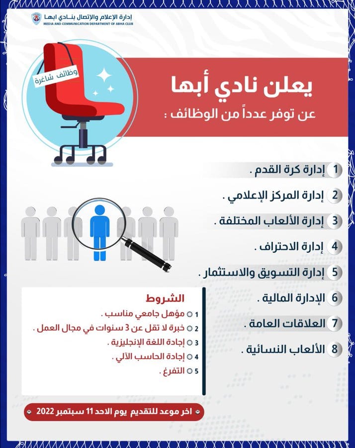 “نادي أبها الرياضي” يكشف عن فتح باب التوظيف في مجالات مختلفة