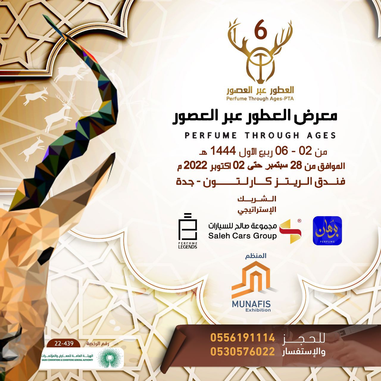تنظم شركة منافس للمعارض و المؤتمرات بفندق الريتز كارلتون – جدة معرض العطور عبر العصور من 02 – 06 ربيع الأول 1444هـ الموافق 28 سبتمبر حتى 02 أكتوبر 2022 م و شراكةً استراتيجيةً لمجموعة الصالح للسيارات – برهان للعطور – بيرفيوم ليجيندز