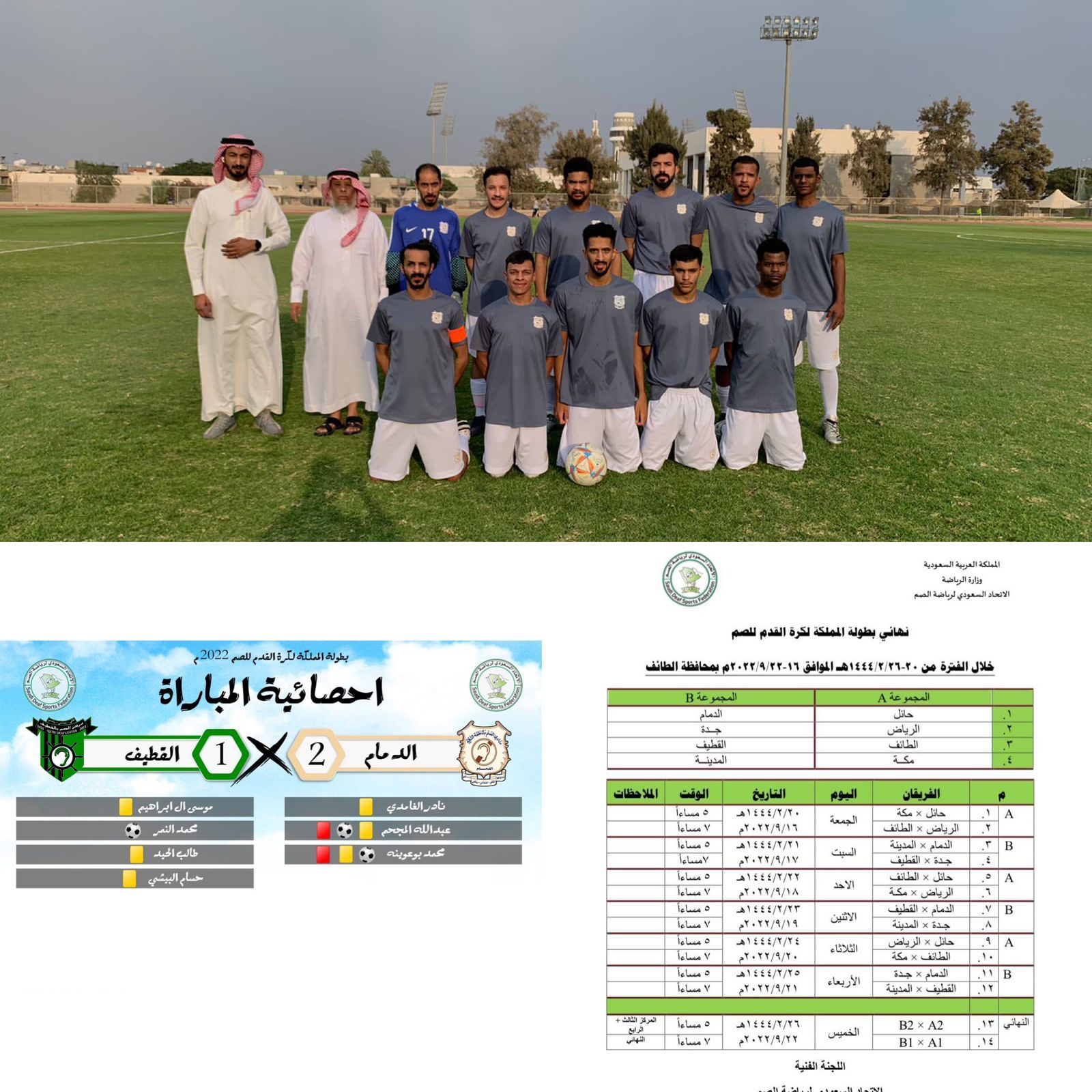 حقق فريق صم الدمام لكرة القدم فوزه الثاني على التوالي بعد تغلبه على فريق صم القطيف بنتيجة 2-1 في اللقاء الذي أقيم يوم الاثنين 23-2-1444هـ ضمن منافسات نهائي بطولة المملكة لكرة القدم للصم المقامة حالياً في الطائف سجل أهداف صم الدمام اللاعب عبدالله المجحم اللاعب محمد بوعوينه ، وسجل لصم القطيف اللعب محمد النمر.