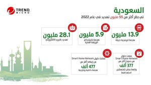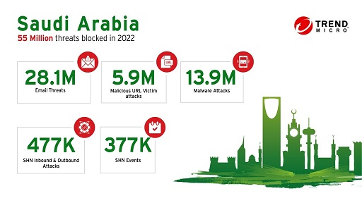 وعلى صعيد المملكة المملكة العربية السعودية، قامت حلول تريند مايكرو باكتشاف وحظر أكثر من 28 مليون تهديد عبر البريد الإلكتروني، وحالت دون ما يقرب من 6 ملايين هجوم ضار عبر الروابط الضارة. بالإضافة إلى ذلك، تم تحديد وإيقاف ما يقرب من 14 مليون هجوم برمجيات خبيثة.