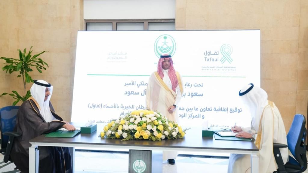 ومن جهة أخرى شهد صاحب السمو الملكي الأمير سعود بن طلال بن بدر محافظ الأحساء توقيع اتفاقية تعاون بين سعادة رئيس مجلس إدارة جمعية مكافحة السرطان الخيرية بالأحساء تفاؤل الأستاذ محمد بن عبدالعزيز العفالق، وسعادة الأستاذ فهد بن إبراهيم بن عبد العزيز الخلف رئيس مجلس إدارة المركز الوطني لأمراض الدم والأورام