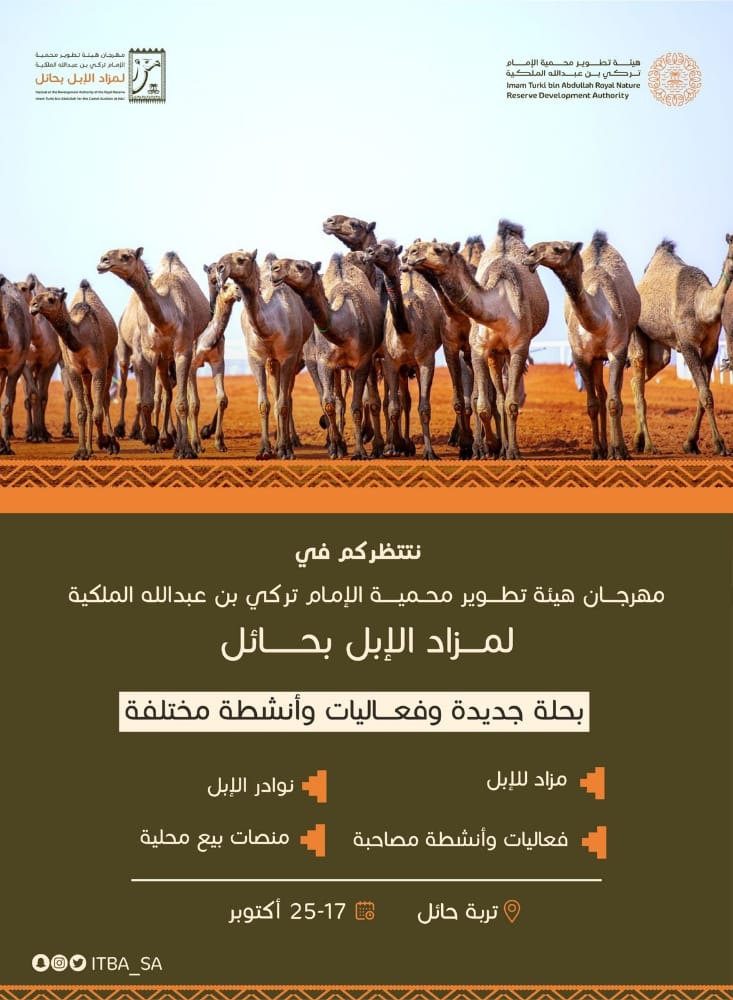 ينطلق غدًا مزاد تربة حائل للإبل في نسخته الجديدة, وذلك بموقع الأنشطة الموسمية جنوب مدينة تربة الواقعة على بعد 200 كلم شمال حائل, الذي تنظمه هيئة تطوير محمية الإمام تركي بن عبد الله الملكية بالتعاون مع إمارة حائل .