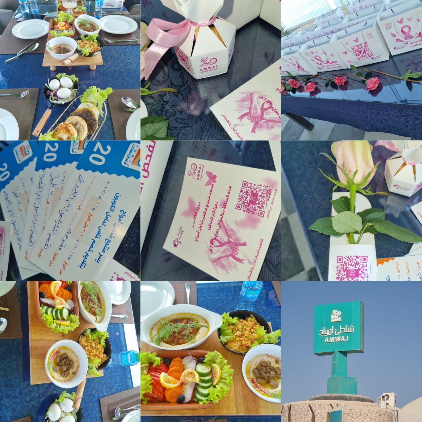 بمناسبة الشهر العالمي للتوعية بسرطان الثدي والذي يصادف شهر أكتوبر، ويهدف للتثقيف الصحي حول أهمية الكشف المبكر لتفادي الخطورة وتسريع العلاج نظم مطعم ومنتجع أمواج بالدمام مبادرة إفطار ضم العديد من المتعافيات والمصابات وتبادلن اطراف الحديث عن تجربتهن مع مرض السرطان وكيف اثبتوا قوتهم بالتغلب على المرض والانتصار عليه بالصبر والاحتساب وثقتهم بالله بان ما أصابهم محبة من الله ، وإنهن قويات للتغلب على هذا المرض الضعيف الذي سوف يزول بقوة الايمان بالله ثم عزيمتهن القوية التي كانت سبب في شفائهن .