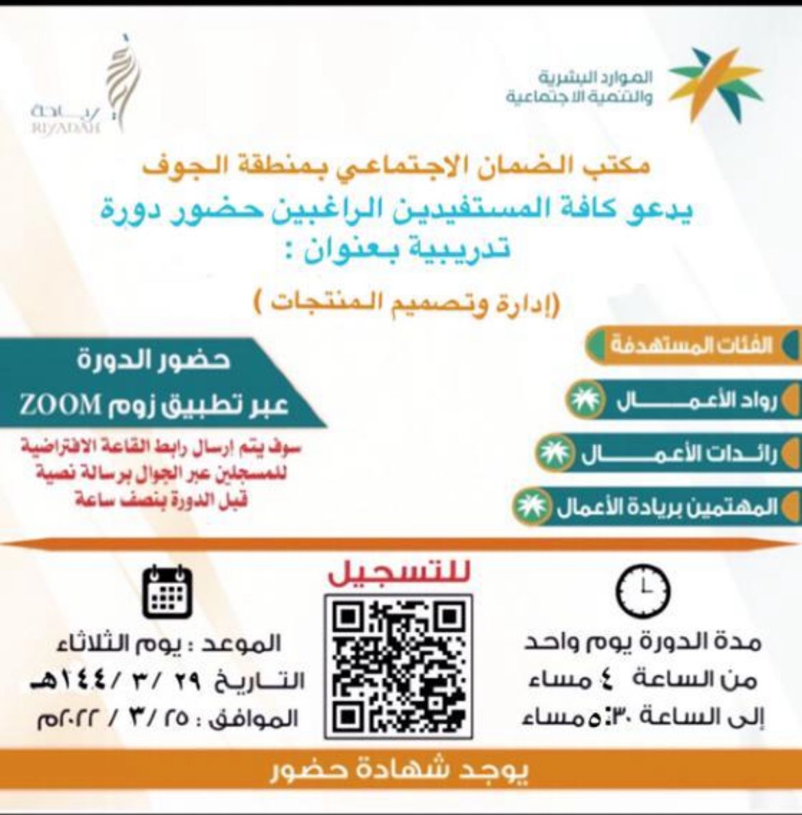 نظم مكتب الضمان الاجتماعي المكتب الرئيسي بمنطقة الجوف ممثلا بقسم التمكين الثلاثاء الموافق ١٤٤٤/٣/٢٩ هـ دورة تدريبية ، بالتعاون مع معهد رياده بالجوف بعنوان (إدارة وتصميم المنتجات ) .
