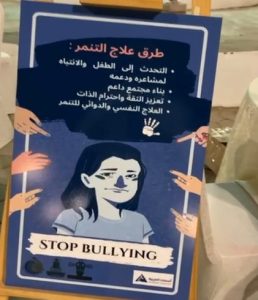 أو نشر الشائعات أو غيرها من الأمور. كما تم التحدث عن طرق مواجهة الأطفال وزيادة وعي الأطفال وذويهم عن هذه الظاهرة ،وتم  توزيع العديد من الهدايا الرمزية للزوار .