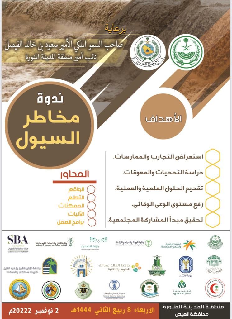 تنفيذاً لتوجيه صاحب السمو الملكي الأمير/ فيصل بن سلمان بن عبدالعزيز آل سعود أمير منطقة المدينة المنورة وبرعاية كريمة من صاحب السمو الملكي الأمير/ سعود بن خالد الفيصل آل سعود نائب أمير المنطقة، وبدعم سعادة مدير عام الدفاع المدني تنطلق اليوم  الأربعاء 8 ربيع الأول 1444هـ الموافق 2 نوفمبر 2022م ندوة بعنوان: “مخاطر السيول” بمركز التنمية الاجتماعية بمحافظة العيص بمشاركة نخبةً من المتخصصين في هذا المجال يمثلون أكثر من (20) هيئة وجهة حكومية متخصصة.