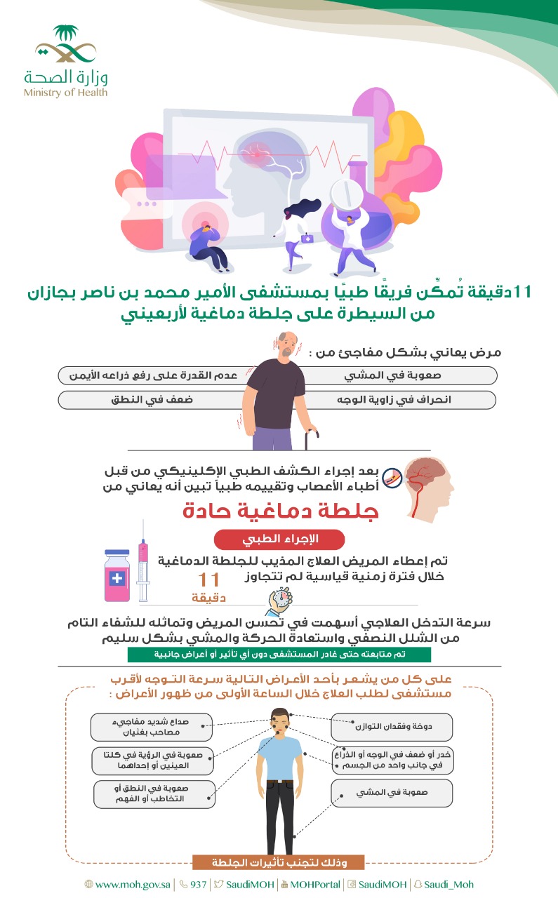 11 دقيقة تمكن فريقًا طبيًا بمستشفى الأمير محمد بجازان من السيطرة على جلطة دماغية لأربعيني