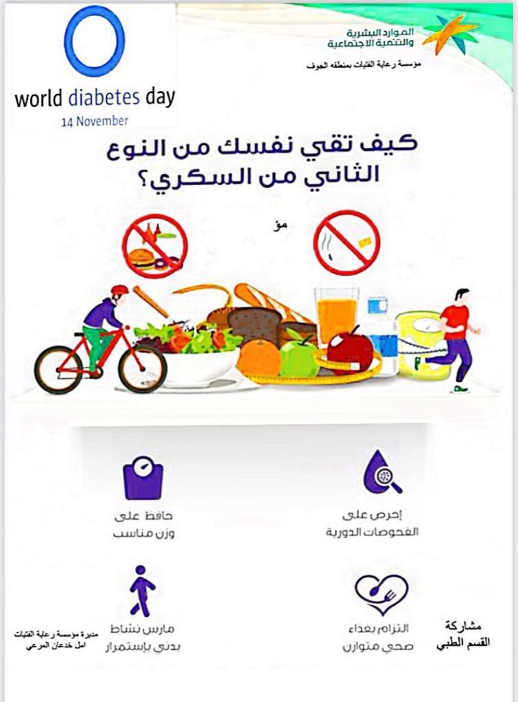 تزامنا مع اليوم العالمي للسكري والذي يصادف ١٤نوفمبر من كل عام فعلت مؤسسة رعاية الفتيات بالجوف الاحتفال باليوم العالمي للسكري من خلال تنفيذ بروشرات توعويه لمنسوباتها بهدف رفع مستوى الوعي حول تأثير داء السكري في المجتمع، وتشجيع التشخيص المبكر،