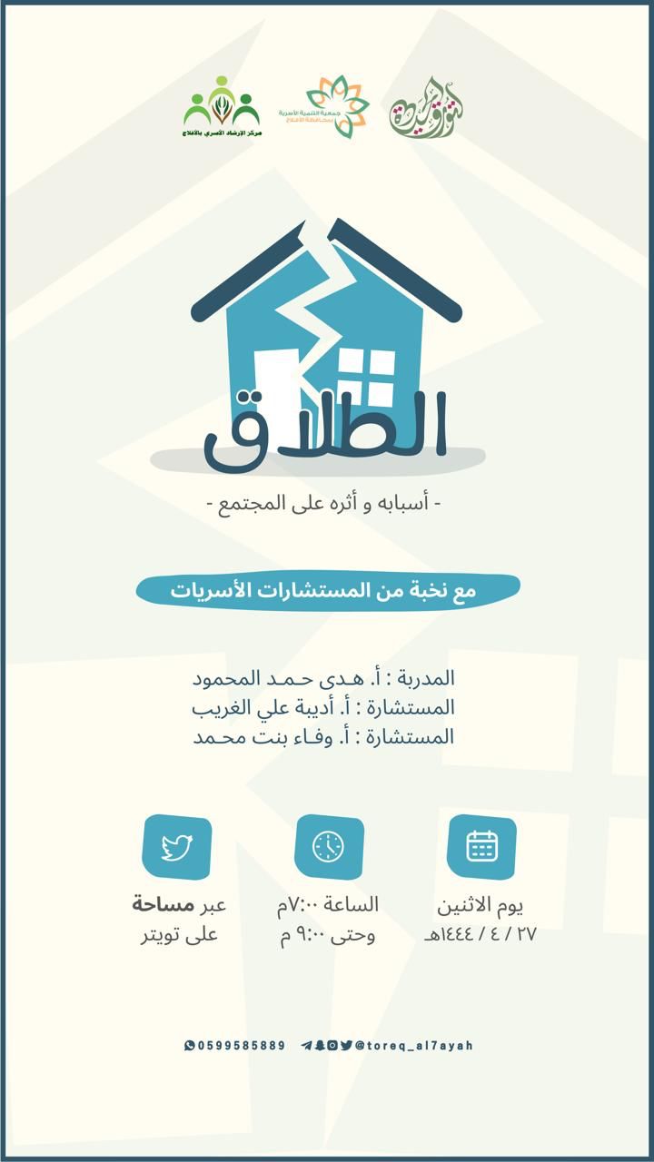 ضمن حملة ( لا للطلاق ) التي تنظمها جمعية التنمية الأسرية بالأفلاج أقيم مساء اليوم ندوة عن الطلاق : أسبابه وأثره على المجتمع والمخصص للنساء قدمها نخبة من المستشارات الأسريات عبر مساحة تويتر في حساب القسم النسائي.
