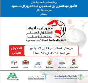 برعاية كريمة من سمو أمير حائل ووزير البيئة والمياه والزراعة .. فرع وزارة البيئة يطلق مهرجان مأكولات الاستزراع السمكي