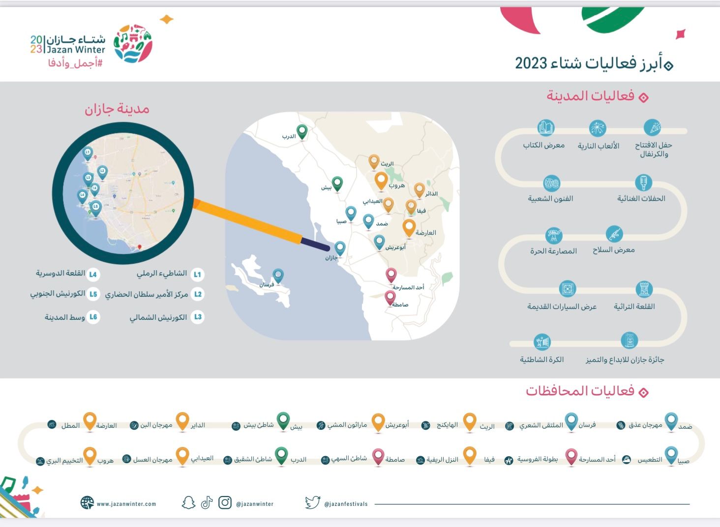 يُذكر أن مهرجان شتاء جازان ينطلق خلال العام الحالي في 12 يناير الى مارس ويتضمن عددًا من الفعاليات النوعية التي تشمل جميع محافظات منطقة جازان.