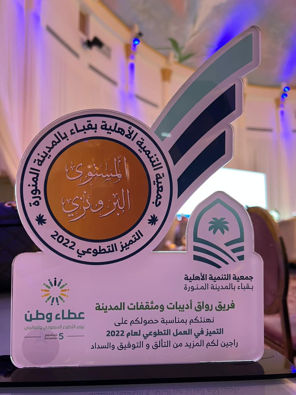 ضمن الاحتفاء بـ “يوم التطوع السعودي و العالمي”، تم تكريم فريق رواق أديبات و مثقفات المدينة و الذي حصل على درع المستوى البرونزي في حفل تكريم التميز في العمل التطوعي للعام 2022. ضمن تكريم جميع الفرق التطوعية، من جمعية التنمية الاهلية بقباء بالمدينة المنورة.