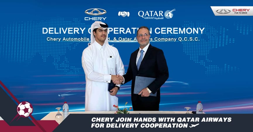 أعلنت شركة شيري العالمية للسيارات عن توقيعها اتفاقية يتم بموجبها اعتماد سيارات شيري كناقل رسمي لركابها المسافرين من والى قطر لحضور فعاليات كأس العالم قطر 22.