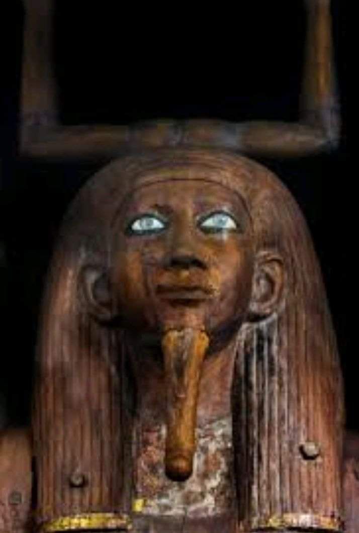 وأكد أن التمثال مصنوع بالكامل من خشب الجميز المرن القابل للنحت وأما عيناه فهي مرصعة بالكوارتز والبللور الصخري موضوع داخل حجرته من الخشب “ناووس” وهو تمثال للملك “أو ایب رع حور” وكان مغطى بطبقة من الجص وعند تعرضها للهواء عند الاكتشاف سقطت، يرتدي فوق رأسه رمز الكا بالهيروغليفية وهي عبارة عن يدين مرفوعتان ويرتدي الشعر المستعار تنحسر عن الأذنين، ويرتدي أيضا الذقن المستعار المعقوفة وكان يمسك بيده اليمني صولجان “في رأي آخر أنها ريشة الماعت” واليسرى عصا و لكنهما مفقودان، وأيضا كانت هناك نقبة ذهبية وسرقت ويقف التمثال على قاعدة خشبية وهو داخل ناووس يعتقد أنه كان إما مواجه لباب المقبرة لفتح الطريق أو إنه كان يقابل منضدة لتلقي القرابين عليها، والتمثال هنا مجرد تمامًا من الملابس وبملامح صارمة وتدل على إشراقة الحياة الأبدية.