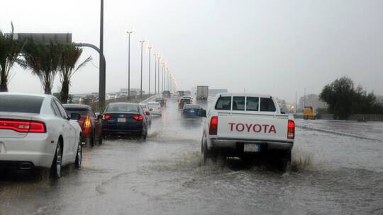 غمرت أمطار غزيرة عدة طرق في مدينة جدة السعودية المحاطة بصحراء. وشوهدت سيارات عالقة بسبب ارتفاع منسوب المياه، وشوارع غارقة، ومنازل متضررة.