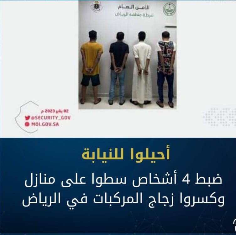 ضبط 4 أشخاص سطوا على منازل وكسروا زجاج المركبات في الرياض