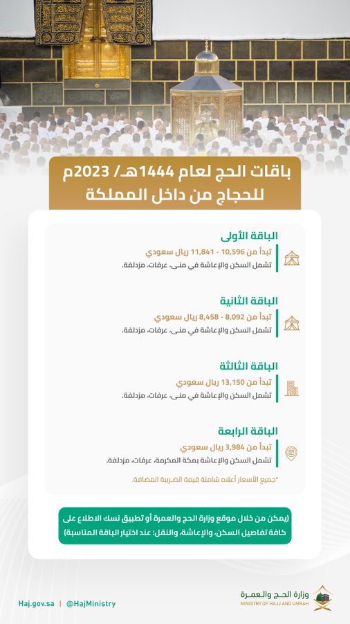 وحددت عبر البوابة الإلكترونية أربع باقات تبدأ من 3,465 ريال للباقة الأدنى، وتصل إلى 11,435 ريال للباقة الأعلى “غير شاملة ضريبة القيمة المضافة”، كما أن أسعار الباقات لا تشمل سعر النقل إلى ومن مكة المكرمة.