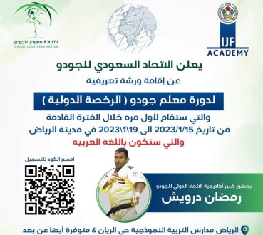 أعلن الاتحاد السعودي للجودو عن إقامة ورشة تعريفية لدورة معلم جودو ( الرخصة الدولية) والتي ستقام لأول مرة خلال الفترة القادمة من تاريخ 15/ 1/ 2023 إلى 19/ 1/ 2023 في مدينة الرياض والتي ستكون باللغة العربية بحضور خبير أكاديمية الاتحاد الدولي للجودو رمضان درويش.