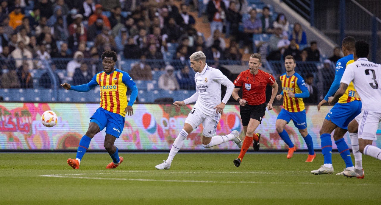تأهل ريال مدريد إلى المباراة النهائية لكأس السوبر الإسباني بعد فوزه على نظيره فالنسيا بركلات الترجيح بنتيجة 4-3 عقب انتهاء الوقت الأصلي والإضافي بالتعادل الإيجابي بهدف لكل منهما في المباراة التي جمعتهما مساء اليوم على ملعب الملك فهد الدولي بمدينة الرياض في إطار منافسات نصف نهائي كأس السوبر الإسباني.