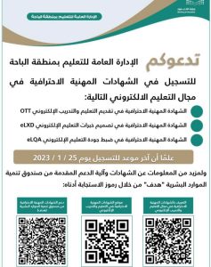 دعت الإدارة العامة للتعليم بمنطقة الباحة للتسجيل في الشهادات المهنية الاحترافية في مجال التعليم الإلكتروني وهو كما يلي على النحو التالي: