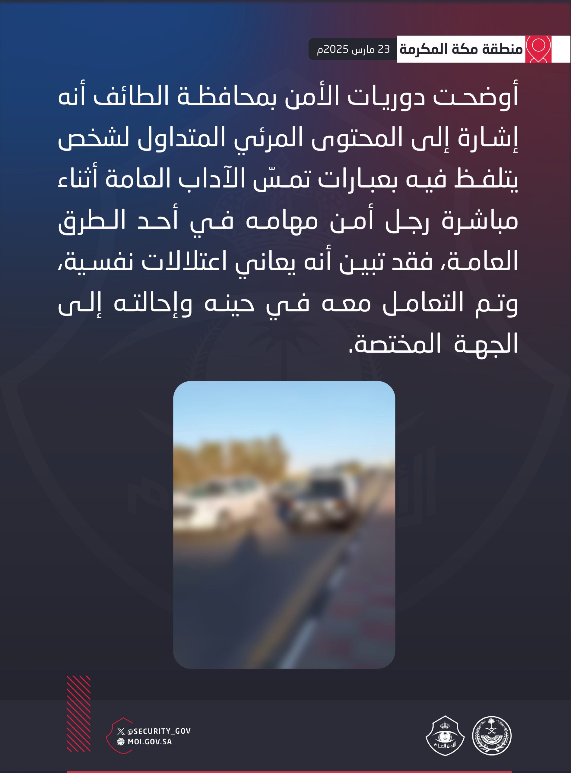 أحالت دوريات الأمن في محافظة الطائف رجلًا تلفظ بعبارات تمس الآداب العامة أثناء مباشرة رجل أمن مهامه، إلى الجهة المختصة.