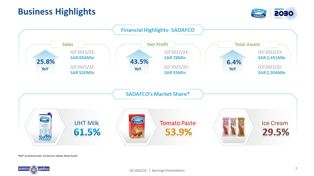 أعلنت الشركة السعودية لمنتجات الألبان والأغذية (سدافكو)، الشركة الرائدة في إنتاج الحليب طويل الأمد في المملكة العربية السعودية، عن تحقيق نتائج مالية قويّة في الربع الثالث من العام المالي 2022/2023. وسجّلت “سدافكو” أرباحًا صافية أعلى بنسبة 43.5 في المئة مقارنة بالربع نفسه من العام المالي السابق.