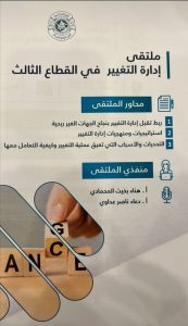 تناول الملتقى الذي نفذته الأستاذتان هناء بخيت المحمادي ودعاء ناصر عداوي، ثلاثة محاور هم: ربط تقبل إدارة التغيير بنجاح الجهات غير الربحية، واستراتيجيات ومنهجيات إدارة التغيير، والتحديات والأسباب التي تعيق عملية التغيير وكيفية التعامل معها.