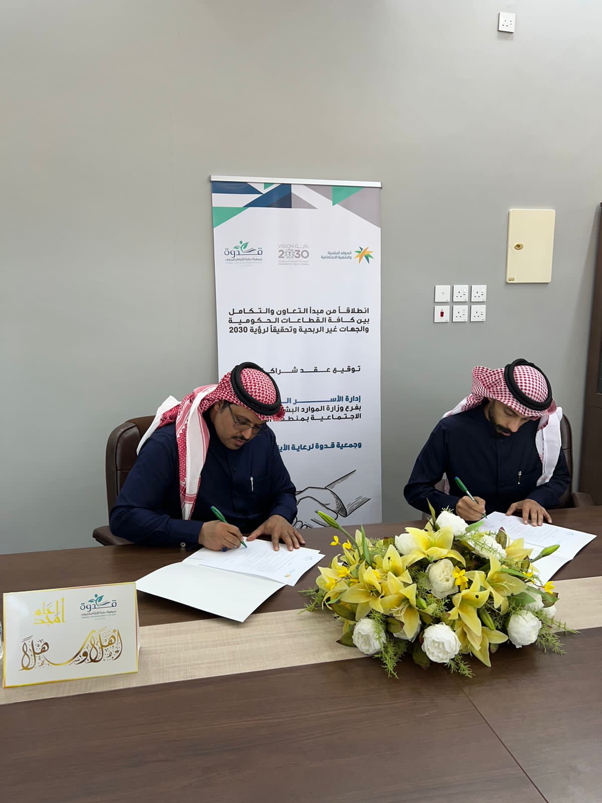 وقع فرع وزارة الموارد البشرية والتنمية الاجتماعية بمنطقة الجوف ممثلا بإدارة الأسر الكافلة عقد شراكة مع جمعية قدوة لرعاية الأيتام بالجوف ، مثل الفرع مدير إدارة الأسر الكافلة الأستاذ/ راشد بن محمد القحطاني ، و مثل جمعية قدوة الأستاذ/ محمد بن سالم الابراهيم .