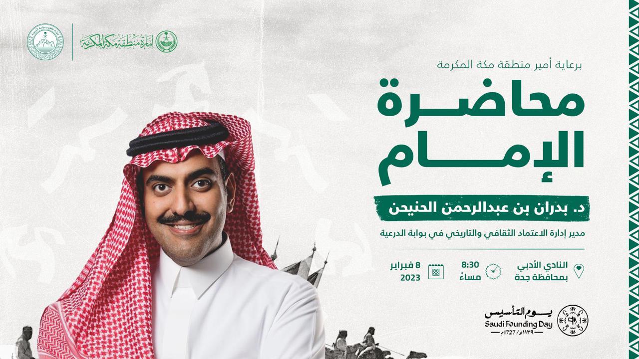 برعاية صاحب السمو الملكي مستشار خادم الحرمين أمير منطقة مكة المكرمة الأمير خالد الفيصل ، وبمناسبة ذكرى يوم التأسيس تقيم هيئة تطوير بوابة الدرعية محاضرة (الإمام) ، يقدمها الدكتور بدران الحنيحن مدير عام إدارة الاعتماد الثقافي و التاريخي ، وذلك مساء يوم الأربعاء 8/فبراير/2023م، بمقر النادي الأدبي الثقافي بجدة.
