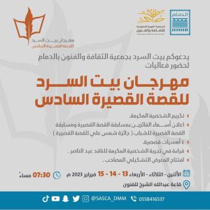 تنظم جمعية الثقافة والفنون بالدمام ـ،ممثلة ببيت السرد الثلاثاء المقبل ١٣ فبراير ٢٠٢٣م وحتى ١٥ فبراير ٢٠٢٣ م والذي يوافق يوم القصة العالمي ، في مهرجان بيت السرد للقصة القصيرة السادس ، بمجموعة من الأمسيات ، وتكريم شخصية هذا العام القاصة والكاتبة ليلى إبراهيم الأحيدب.