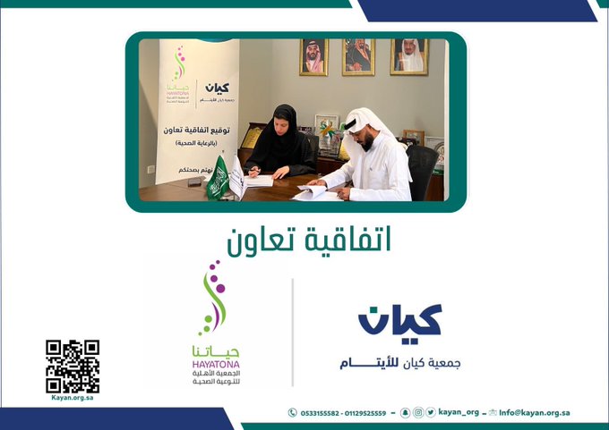 تحقيقا لأهداف “جمعية كيان” للأيتام ذوي الظروف الخاصة في تفعيل الشراكات الفاعلة مع القطاع الخاص ورغبةً في تفعيل الإستراتيجية الوطنية للتكامل بين القطاعات وقعت “جمعية كيان” اتفاقية تعاون مع الجمعية الأهلية للتوعية الصحية “حياتنا” .
