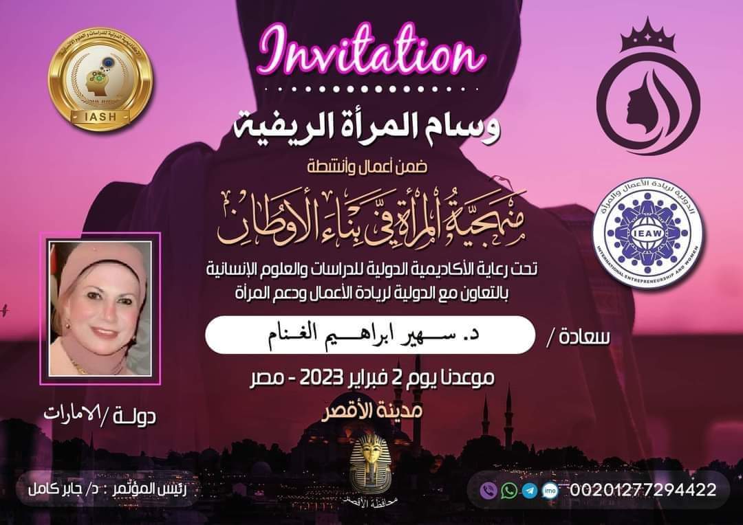 فازت دكتورة سهير الغنام عضو الأكاديمية الدولية للدراسات والعلوم الإنسانية وممثل عام للأكاديمية بدولة الإمارات العربية المتحدة بوسام المرأة الريفية صانعة الإنجازات لعام 2023 ، ضمن أعمال وأنشطة مؤتمر منهجية المرأة في بناء الأوطان،