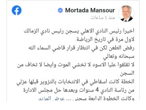 وكتب مرتضى منصور، عبر حسابه الرسمي بموقع التواصل الاجتماعي “فيسبوك”، تغريدة مؤثرة بعد صدور الحكم بسجنه، وجاء فيها: “أخيرا رئيس النادي الأهلي يسجن رئيس نادي الزمالك لأول مرة في تاريخ الرياضة”.