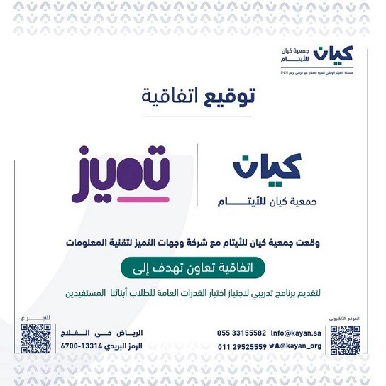 تفعيلاً للشراكات المجتمعية وقعت جمعية كيان للأيتام ذوي الظروف الخاصة ، اتفاقية تعاون مع شركة وجهات التميز لتقنية المعلومات “منصة تميز tmyyozsa ” بهدف تقديم مقاعد مجانية في برنامج تدريبي لاجتياز اختبار القدرات للطلاب والطالبات من أبنائها المستفيدين. ووقع الاتفاقية عن جمعية كيان الدكتورة غيداء الغامدي مديرة إدارة تطوير الأعمال ، كما وقع عن شركة وجهات التميز الأستاذ عبد الله علي باوزير المدير التنفيذي .