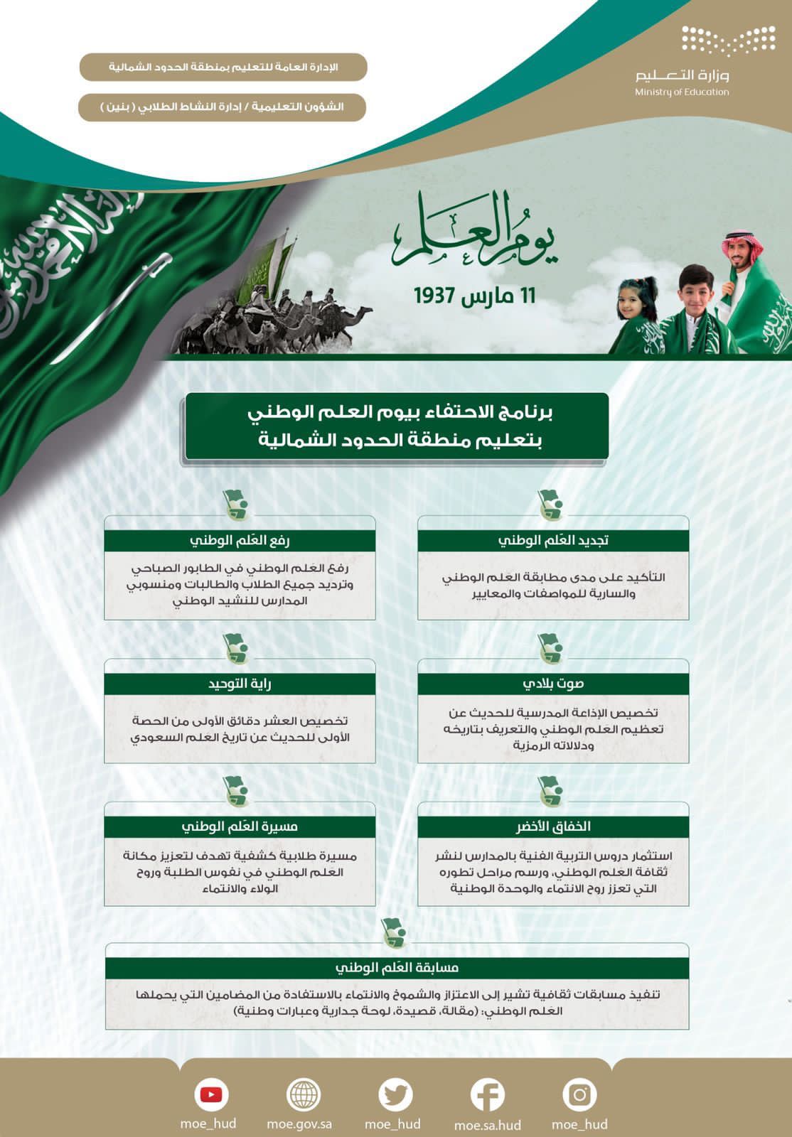 احتفت مدارس منطقة الحدود الشمالية بيوم العلم والذي يعد مناسبة وطنية تحتفي بها المملكة في كل عام كما جاء بالأمر الملكي باعتبار 11 مارس يوم للعلم السعودي والذي يعد رمزاً للوحدة والسيادة ودلالة وطنية نفتخر بها .