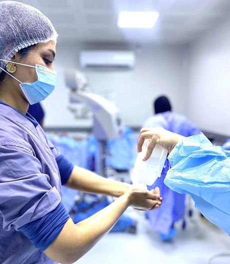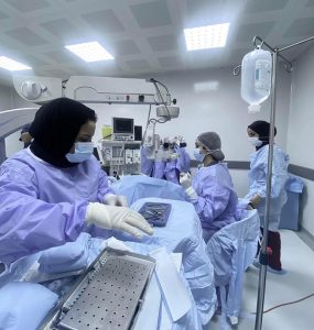 فريق طبي برئاسة أخصائية العيون الدكتورة زهراء عبد الله عبد الشكور يجري عملية طارئة لطفل في قسيم الجراحة ، شُعبة العيون. حيث وصل المريض إلى مستشفى اليرموك التعليمي وهو يعاني من دخول جسم غريب “مسمار” في عينهِ أثناء عملهِ. وبعد الفحص من قبل “الدكتورة زهراء” تبين أن المريض يعاني من جرح عميق في صلبة العين مع بروز السائل الزجاجي ومشيمة العين من داخل الجرح ،وأدخل المريض إلى صالة العمليات وتم خياطة جرح الصلبة والملتحمة وإرجاع العين وأجزائها إلى وضعها الطبيعي وتحت التخدير العام.
