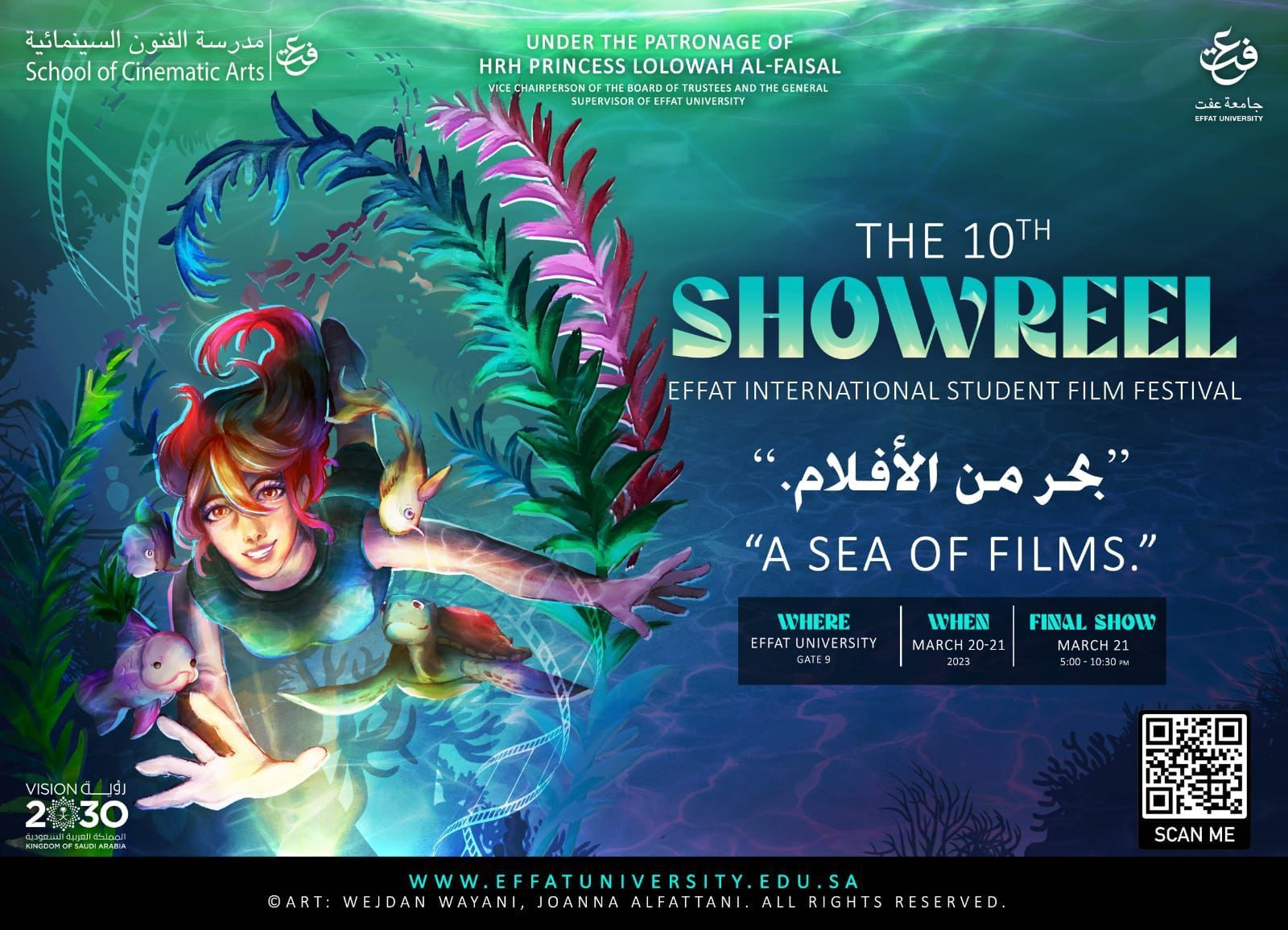 تشهد جامعة “عفت” بجدة مساء يوم غد (الثلاثاء 21 مارس 2023م) الحفل الختامي لمهرجان “عفت” لأفلام الطلبة الدولي في دورته العاشرة تحت شعار “بحر من الأفلام”، وذلك بحضور ورعاية من صاحبة السمو الملكي الأميرة لولوة الفيصل نائب رئيس مجلس الأمناء والمشرف العام على جامعة عفت، والدكتورة هيفاء جمل الليل رئيسة الجامعة، والدكتورة ميرفت شومان وكيلة الجامعة للشؤون الأكاديمية، وعمداء وعميدات وسفراء وسفيرات جامعة “عفت” وجميع ضيوف شرف المهرجان.
