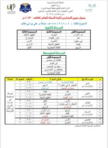 أصدرت اليوم اللجنة المنظمة لبطولة المدراس الجدول الثالث لمباريات وتصفيات منافسات كرة السلة والتي تقام بصالة متوسطة الإمام علي بالمدينة المنورة وتستمر لمدة أسبوع كامل حتى يتحدد المتأهلين للأدوار القادمة.