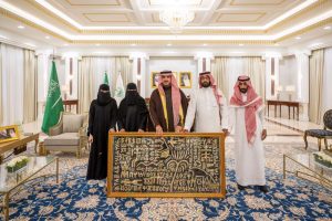 وفي نهاية اللقاء قدَّما لسموه هدية بهذه المناسبة وهي عبارة عن سجادة تحوي نقشاً للخط الثمودي والمسند.