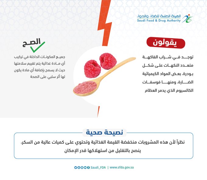 أوضحت الهيئة العامة للغذاء والدواء أنه لاصحة لما يتم تداوله حول احتواء شراب الفاكهة متعدد النكهات على شكل “بودرة” على بعض المواد الكيميائية الضارة، ومنها فوسفات الكالسيوم الذي يدمر العظام.