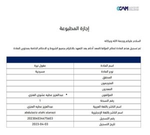 أجازت الهيئة العامة للإعلام المرئي والمسموع اليوم العمل الفني ” عقول نيرة” للكاتب والإعلامي عبد العزيز عطية العنزي تحت رقم (٢٠٢٣٠٤٠٣٤٤٧٥٦٠٣).
