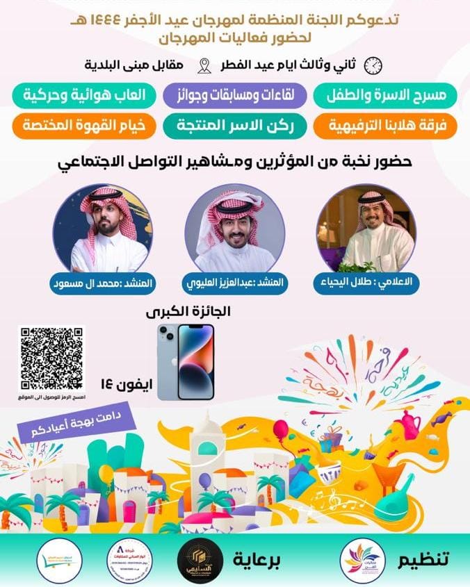 بمناسبة عيد الفطر المبارك ، دعت اللجنة المنظمة لمهرجان عيد الأجفر لحضور فعاليات المهرجان الذي يقام ثاني وثالث أيام عيد الفطر المبارك أمام مبنى البلدية بالأجفر التابعة لأمانة منطقة حائل .