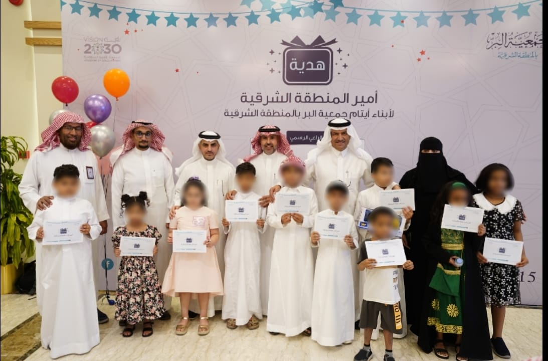 قدم أمير المنطقة الشرقية هدية العيد لأيتام جمعية البر بالمنطقة الشرقية وأقيمت الفاعلية مساء أمس بمقر الجمعية الرئيس بالدمام وشملت معايدة الأيتام بكسوة العيد وعيدية نقدية لكل يتيم ، بحضور مدير فرع وزارة الموارد البشرية والتنمية الاجتماعية عبد الرحمن المقبل ومساعده للتنمية الاجتماعية ابتسام الحميزي و ممثلي وقف عبد الله رشيد الرشيد و مجلس شباب الأعمال بغرفة الشرقية وعدد من داعمي الأيتام وكفلائهم .
