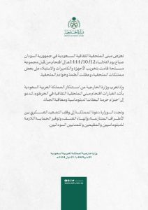 *وجددت الوزارة دعوة المملكة إلى وقف التصعيد العسكري بين الأطراف المتنازعة، وإنهاء العنف، وتوفير الحماية اللازمة للدبلوماسيين والمقيمين وللمدنيين السودانيين.
